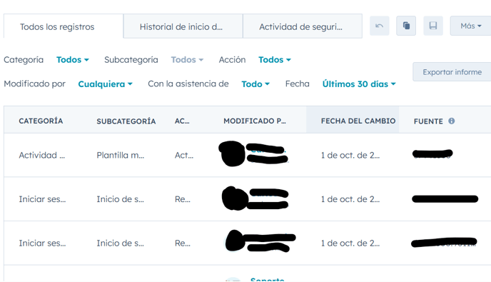 El registro de auditoría está disponible para los superadministradores y es usado para supervisar las acciones de los empleados. Solo se registran las actividades iniciadas directamente por un usuario de HubSpot. Las operaciones automáticas, como las actualizaciones por formularios o flujos de trabajo, no se incluyen en este historial.